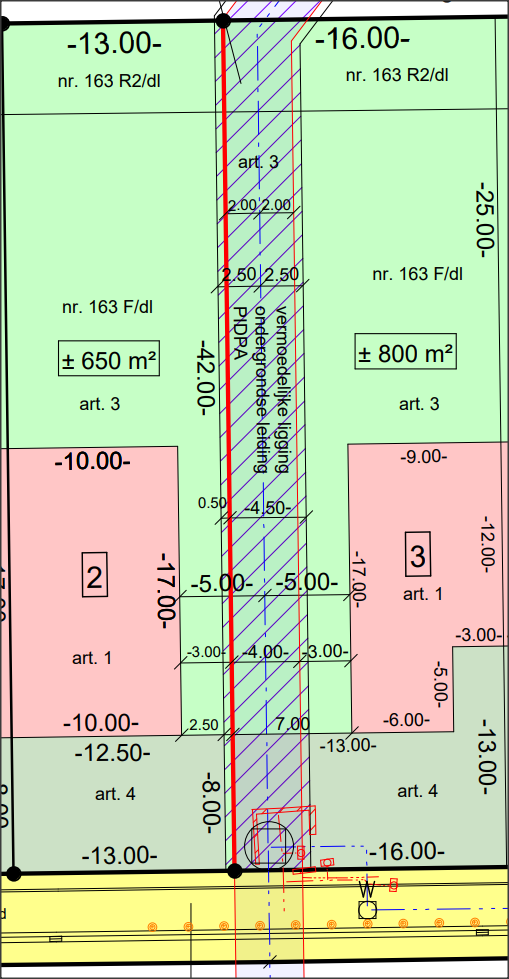 Deze zone op lot 3 kan dus enkel worden gebruikt als gazon, border, tuinstrook zonder schadelijke aanplantingen, bomen of constructies (afsluiting, vijver, zwembad, tuinhuis, garage, parking, carpool etc ...). Om in een wel toegelaten afsluiting te voorzien kan men een tuinpoort van 5 meter breed zetten dwars over de gearceerde zone. Bij toekomstige werken aan de pidpaleiding dient deze tuinpoort dan voor werken geopend te worden. Alleszins zijn deze werken nu voor lange tijd niet actueel omdat de leiding en bezoekruimte in 2020 geheel vernieuwd werden.